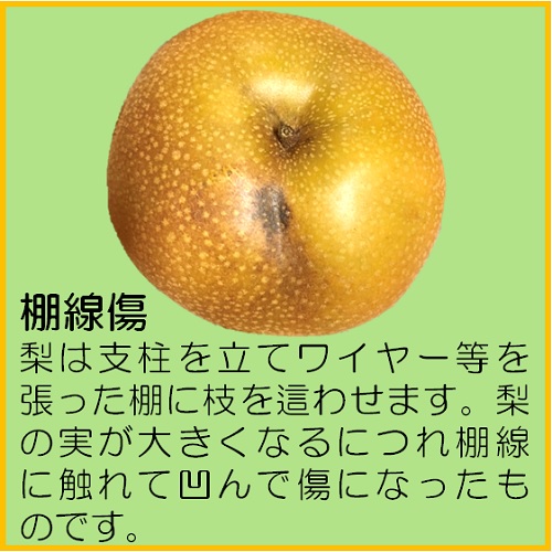 ![]() 梨の生長過程で、強風などで枝などが当たり傷になったものです。 |