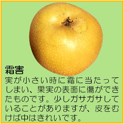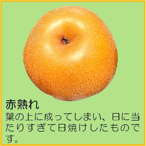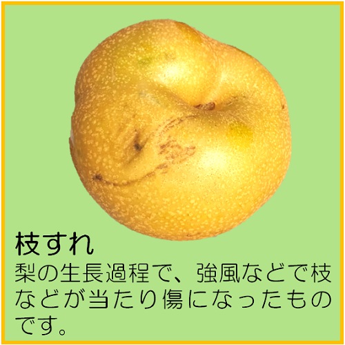 梨は農産物です。春に花が咲き、受粉して実がなって大きくなっていきます。すべての花や実が大きくなって出荷できるわけではありません。同じように手塩にかけて育てても、いびつな形になったり、虫にかじられたり、強風に吹かれて擦れたり、病気にかかったりする梨がたくさんあります。おいしいけど、形や見かけが違うだけのものを集めて「わけあり」としてご案内しています。