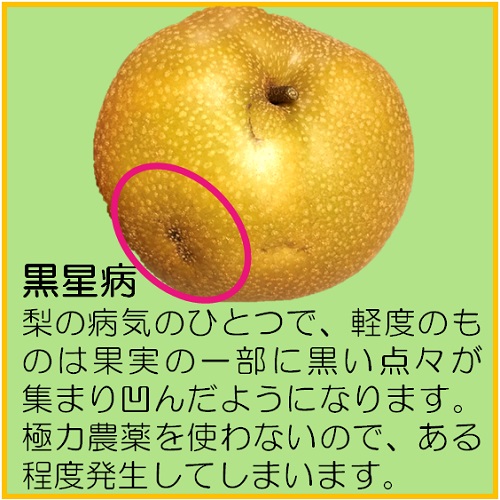![]() 梨の病気のひとつです。ひどい場合は果実が傷んでしまいますが、軽度のものは写真のように果実の一部に黒い点々が集まり凹んだようになります。極力農薬を津沸かないので、ある程度発生してしまいます。 |