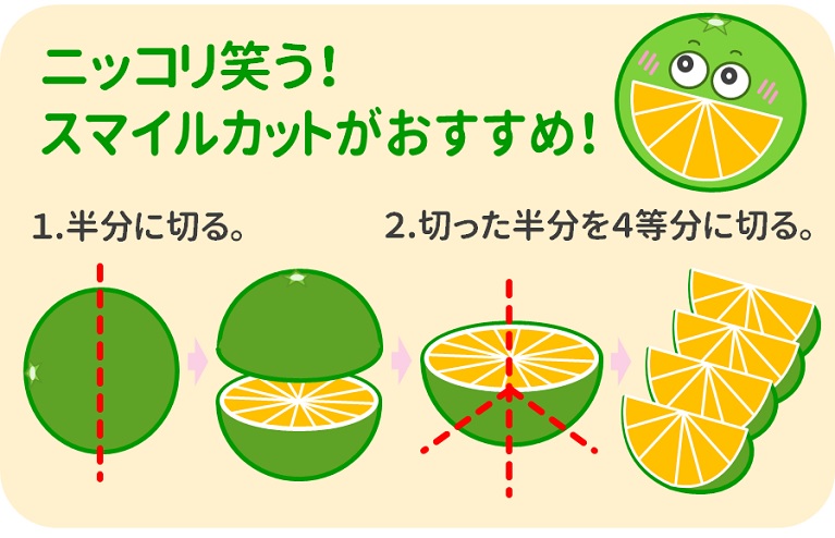 食べ方はシンプルです。はっさくゆずりの皮はゴツゴツと硬めなので、スマイルカット(くし切り)にするのがおすすめです。薄皮はそのままお召し上がりいただけます。