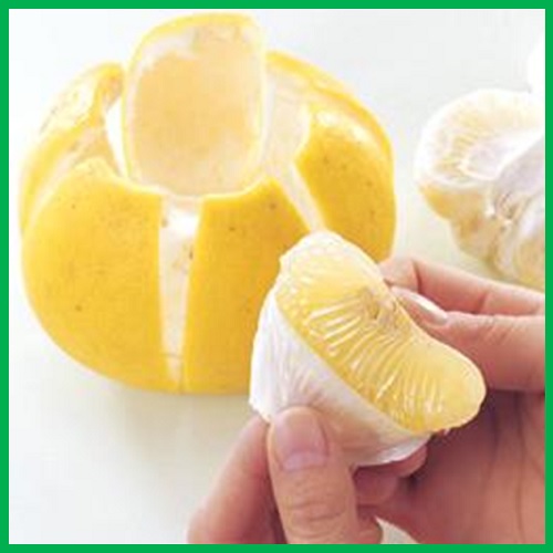 外皮が厚いため包丁やナイフで上と下を切り落し、皮に切れ目を入れてむくのがおすすめです。小袋を開いて果肉を取り出していただきます。