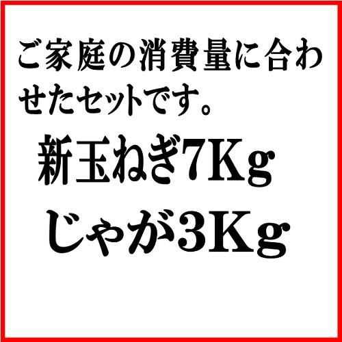 新玉ねぎ7Kgとじゃがいも(出島)3Kgのセットです。じゃがいもは秋冬のじゃがです。一般的な家庭の消費量では玉ねぎがじゃがいもの倍近く消費されていることから、玉ねぎの方が多いセットにしました。