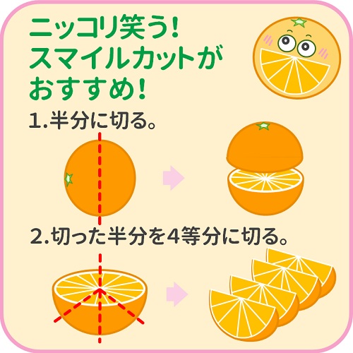 果形が扁平で、皮はみかんよりも少し厚めで皮と実がぴったりくっついているので少しむきにくいですが、ヘタの方からだとむきやすいです。手で皮をむくのもよいですが、スマイルカットにすると食べやすいです。