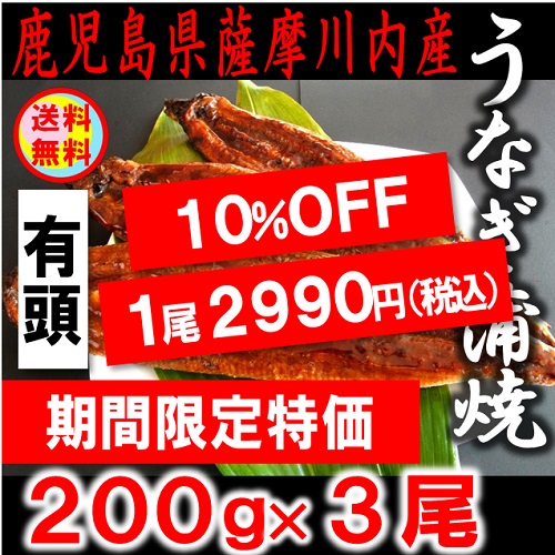 【送料無料】薩摩川内産うなぎ蒲焼200g×3尾(有頭)