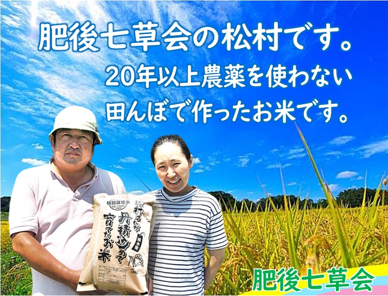 熊本県宇城市松橋町で、2000年から農薬を使わない米作りに取り組んでいます。20年以上、農薬を使っていない田んぼで、より安心・安全で、更においしさをプラスした米作りに頑張っています。