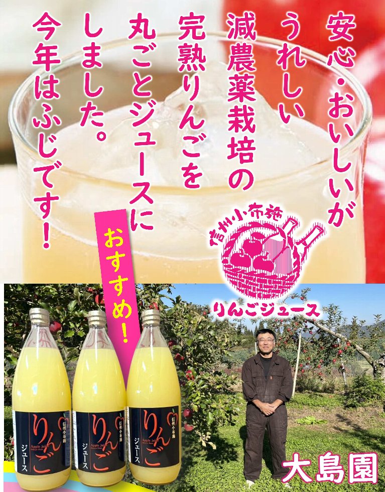 信濃五岳会大島さんが減農薬栽培した 安心・おいしいりんごを まるごとジュースにしました 人気の品種ふじ! とても濃厚な美味しさを味わえます。 おくりものや手土産にもおすすめです! |