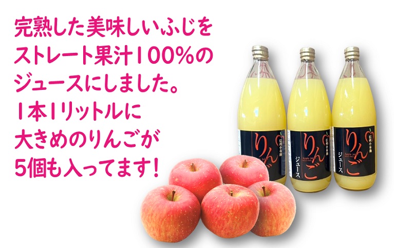 原料りんごの品種はふじ。ふじは生産量№1でダントツ人気のりんごです。甘みと・酸味・歯ごたえの三拍子そろった美味しいりんごです。食べる時には甘みと酸味のバランスがとれて、食感もいいですが、まるごとジュースにすると、とても濃厚な甘さを感じられます。1本1リットルに大き目の完熟ふじが5個も入っています。りんごの美味しさを凝縮した「飲むりんご」です。コップ1杯で毎朝のエネルギー補給に最適です。お子様には水で割ってあげるのもおすすめです。 |