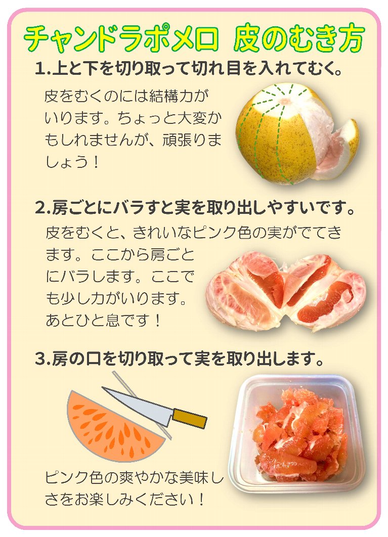 皮がとても厚いので包丁でむいてください。①包丁で上(頭)と下(おしり)をカットする。②包丁で側面に切れ目を入れる。③切れ目に沿って手で剥く。④中の薄皮を手で剥く。 プチプチした食感をいかし、ヨーグルトなどに入れて食べてもおいしいですよ。 皮は文旦と同じように砂糖漬けにしても楽しめます。 切り方・食べ方の説明書をつけてお届けします。 |