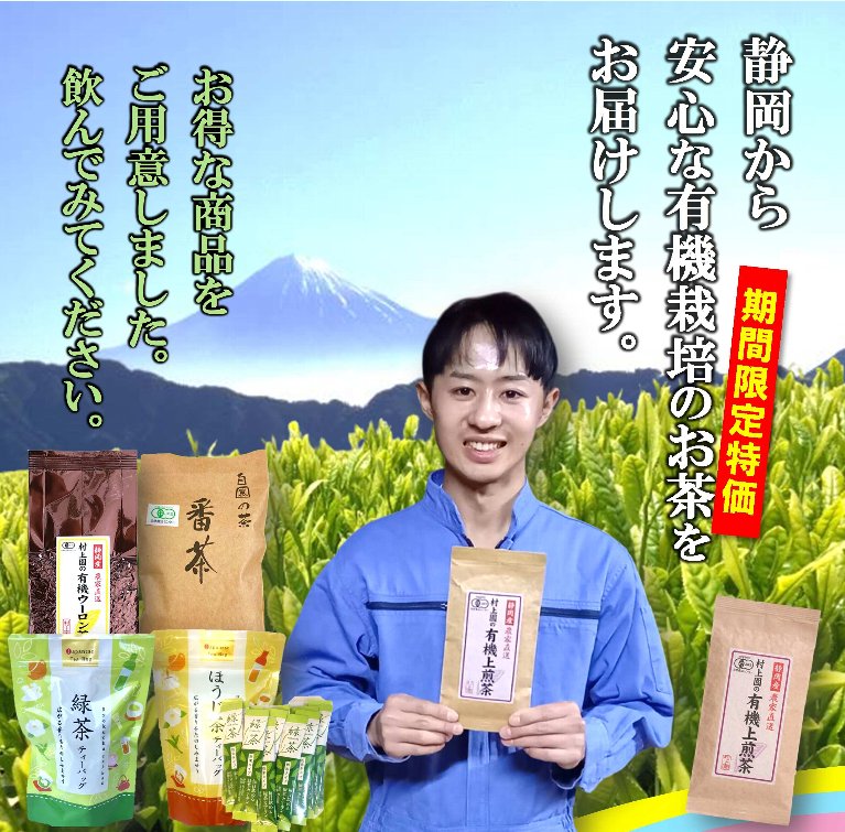 今回、たくさんのみなさんに飲んでいただこうと、期間限定特価でご案内することにしました。有機栽培の煎茶の他、ウーロン茶やティーバッグ等もご用意しました。この機会にぜひ村上園の美味しいお茶を飲んでみてください!