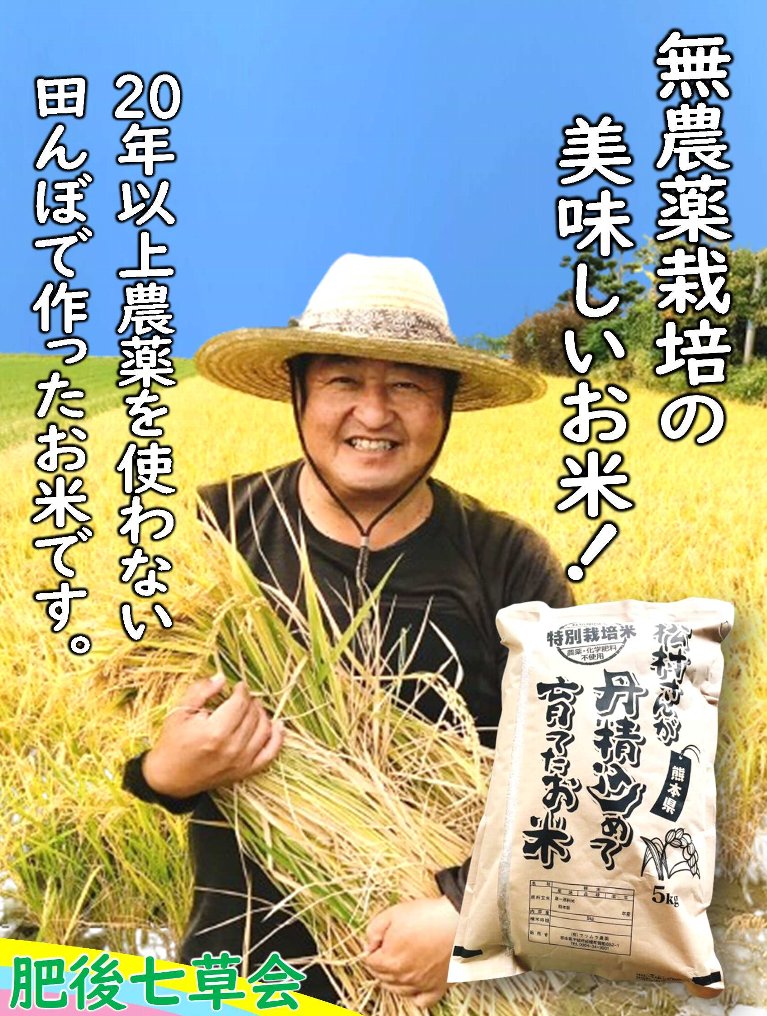 20年以上、農薬を使わない田んぼで作ったお米です。土づくりは有機の発酵肥料を使用し、植物本来の力を引き出し、病気や害虫に負けない健康な稲を育てています。その事で、食味も良く美味しいお米づくりができています。 今年は花の時期に台風が来て、その後は酷暑が続き雨も少ない状況が続きました。厳しい条件が色々と重なった影響で例年よりも生長がよくなく、収穫量が3割ほど減ってしまいました。 厳しい気象条件の中でも、元気に育ったお米をお届けします。安心して食べてください。 肥後七草会 松村和則
