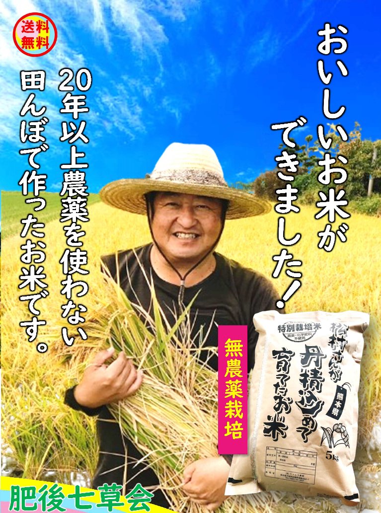 20年以上、農薬を使わない田んぼで作ったお米です。土づくりは有機の発酵肥料を使用し、植物本来の力を引き出し、病気や害虫に負けない健康な稲を育てています。その事で、食味も良く美味しいお米づくりができています。 今年も酷暑のなか、開花時期の天候にも恵まれ、台風や害虫の被害もなく順調に育ちました。収量は例年通りとはいきませんでした。暑さの影響と思われます。 8月中旬の大雨により熊本県内では大きな浸水の被害が出ました。我が家も圃場も海の近くの干拓地にあるため、大変心配しましたが、排水機場が2ヶ所あるため、どうにか浸水をまぬがれることができました。 今後も「異常気象」という名の日常がやって来ると思いますが、これからも負けないよう頑張って作り続けます。 厳しい気象条件の中でも、元気に育ったお米をお届けします。安心して食べてください。 肥後七草会 松村和則