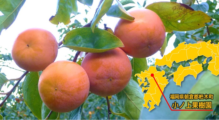 日本一の甘柿産地として知られる、福岡県朝倉郡杷木(はき)町在住。柿を栽培して50年以上。その間に築き上げてきた栽培技術等で、全国に知られる有名な柿生産者です。 小さい頃はブルドーザーの運転手を目指していたという小ノ上さんは、今8町歩(8ha、80,000平方メートル)の柿農家になった。 山梨の広大なぶどう畑を見て、農業に目覚めた。実家のしいたけ栽培中心の農業を柿とスモモに転換した。1970年(昭和45年)頃のことである。 |