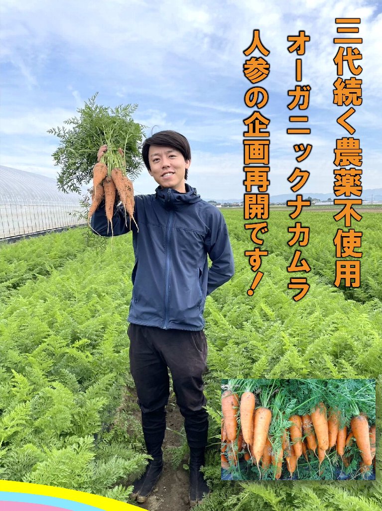 例えば人参は、福岡県の慣行栽培基準では化学合成農薬の使用は9剤となっていますが、オーガニックナカムラでは使用しないで栽培しています。除草剤も使いません!